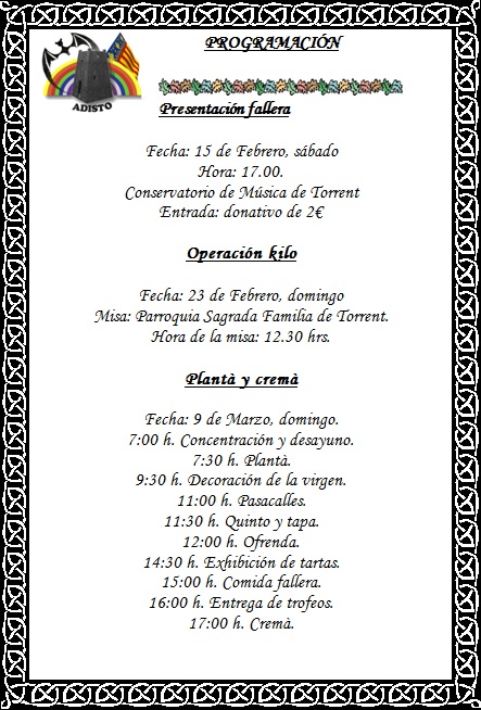 Pueden pasar por ADISTO, C/ La Marina Nº 1 (Bajo) Torrent, para comprar los tickets de la comida fallera del día 9 de Marzo. El precio es 5 € por ticket , precio por socio usuario 0 €. La fecha límite para comprarlos 5 de Marzo.