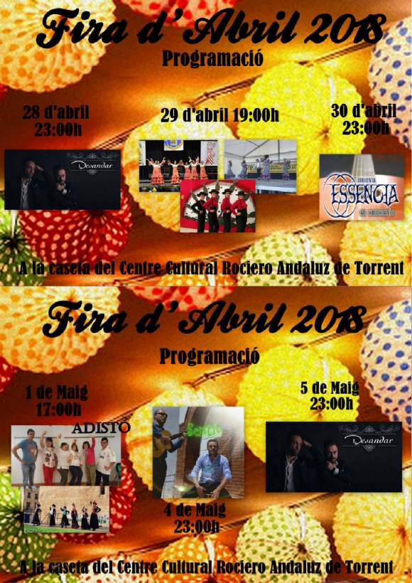 Durante este curso el Centro Cultural Rociero Andaluz de Torrent, de manera voluntaria ha estado viniendo los martes de cada mes a nuestra asociación a dar clases de sevillanas a nuestro grupo de chicas y chicos, y todo lo aprendido lo vamos a mostrar en la FERIA DE ABRIL que se celebra en el antiguo cauce del río Turia el próximo 1 de mayo a las 17:00 hrs. en la caseta del Centro Cultural Rociero Andaluz de Torrent. Os invitamos a venir y disfrutar del espectáculo.